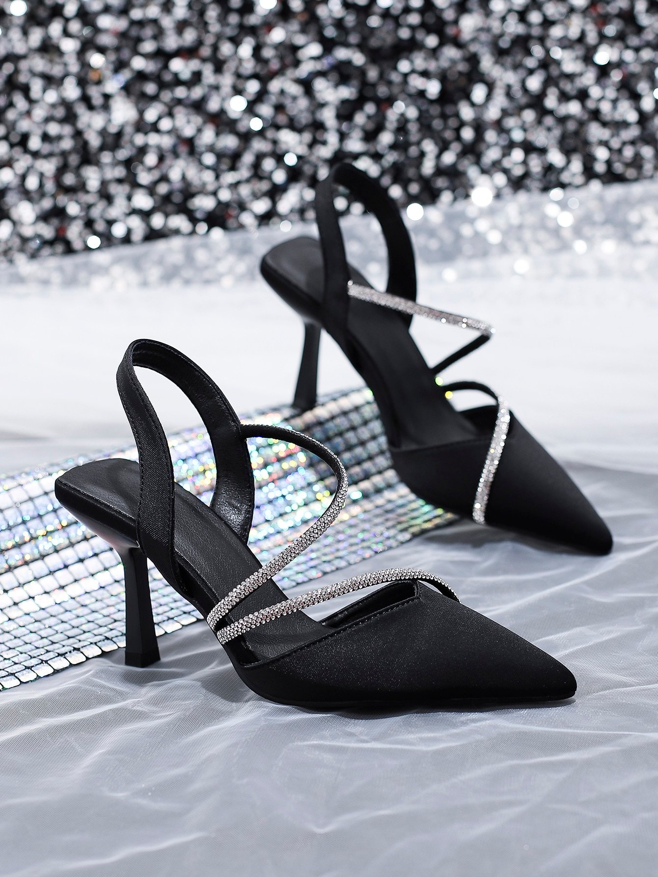 صندل جلدي مرصع بالراين ذو أشرطة متقاطعة وكعب عالٍ