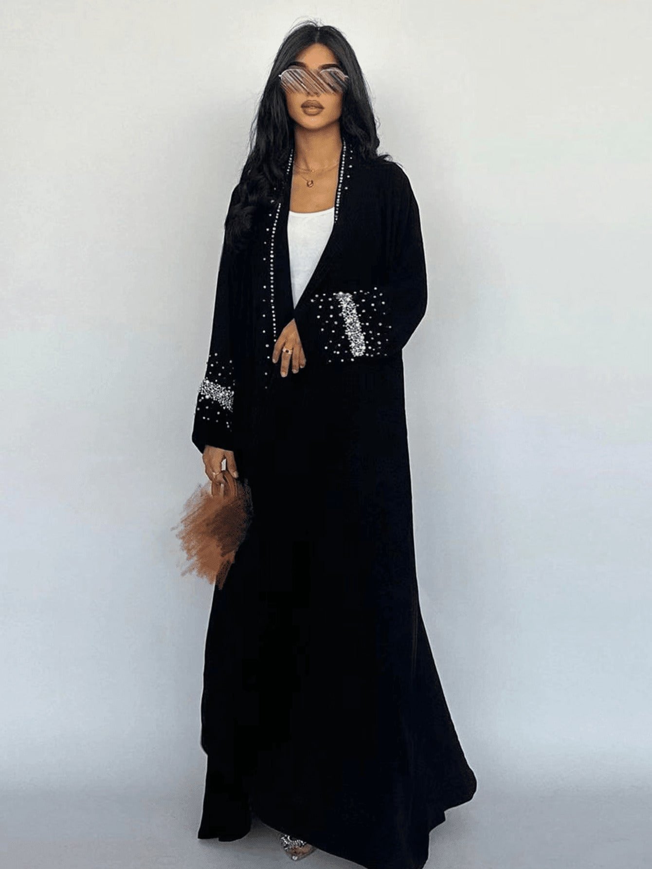 فستان نسائي طويل بلون أسود أنيق، يأتي مع وشاح رأس مزين بالكريستال والكرات الحريرية. تصميم فاخر بلمسة أنثوية جذابة، مثالي للمناسبات الخاصة ويمنحك مظهرًا راقياً مع تفاصيل مميزة تبرز أناقتك.